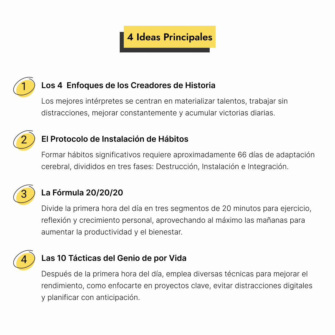 A continuación te brindo notas más detalladas sobre las ideas clave de "El Club de las 5AM" de Robin Sharma, junto con algunas citas que llamaron mi atención. Estas notas no cubren en absoluto toda la amplitud de ideas del libro. En cambio, están destinadas a servir como una introducción a algunas de las ideas principales, para decidir si el libro merece una mayor atención.
