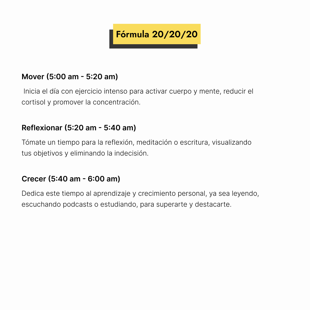 Divide la primera hora del día en tres segmentos de 20 minutos para ejercicio, reflexión y crecimiento personal, aprovechando al máximo las mañanas para aumentar la productividad y el bienestar.