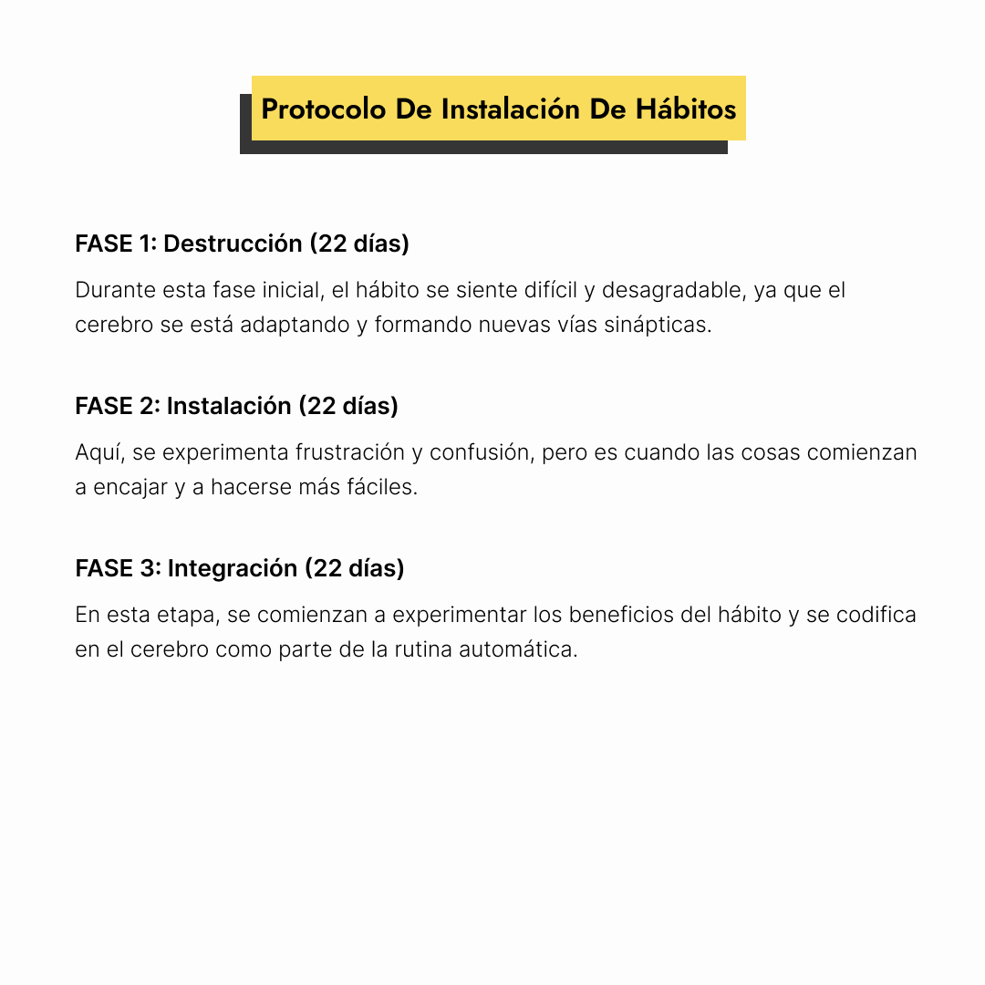 Formar hábitos significativos requiere aproximadamente 66 días de adaptación cerebral, divididos en tres fases: Destrucción, Instalación e Integración.