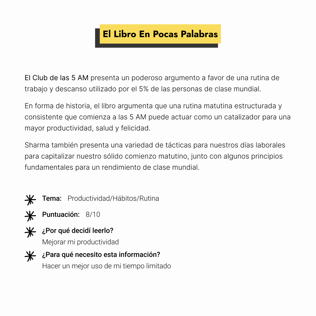 En forma de historia, el libro argumenta que una rutina matutina estructurada y consistente que comienza a las 5 AM puede actuar como un catalizador para una mayor productividad, salud y felicidad.