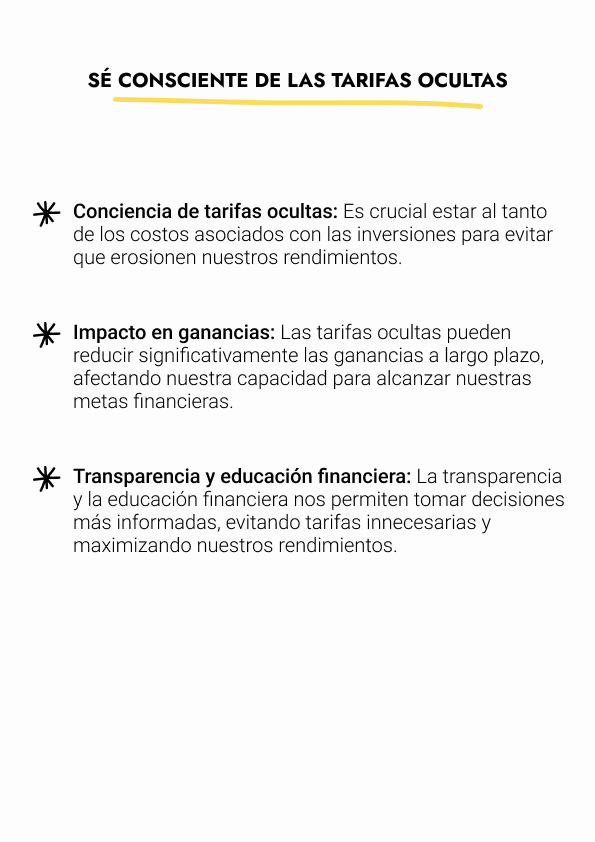 Conciencia de tarifas ocultas: Es crucial estar al tanto de los costos asociados con las inversiones para evitar que erosionen nuestros rendimientos.