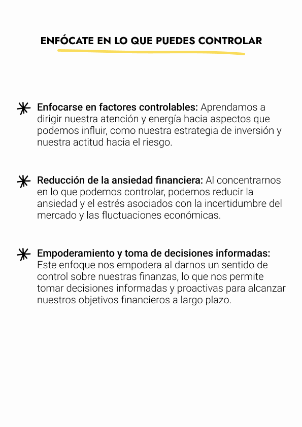 Enfocarse en factores controlables: Aprendamos a dirigir nuestra atención y energía hacia aspectos que podemos influir, como nuestra estrategia de inversión y nuestra actitud hacia el riesgo.