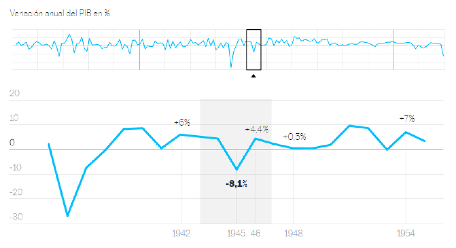 La Segunda Guerra Mundial (1939-1945) tuvo un impacto significativo en la economía española, a pesar de que España se mantuvo neutral durante el conflicto. La economía española experimentó una contracción del 8,1% en su producto interior bruto, lo que refleja el impacto indirecto de la guerra en el país.