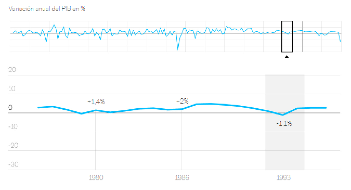 Esta situación condujo a una contracción económica que se prolongó durante varios trimestres. La caída del PIB fue del 1.1%, lo que refleja el impacto significativo de las devaluaciones de la peseta en la economía española. La recesión resultante afectó negativamente a diversos sectores, incluyendo el comercio, la industria y el empleo.